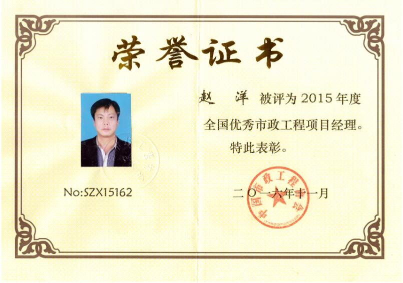 昨日,安徽省市政工程協(xié)會(huì)九屆三次理事會(huì)議在廬江召開,我公司趙洋同志榮獲“2015年度全國優(yōu)秀市政工程項(xiàng)目經(jīng)理”稱號,全省僅有十二位同志獲得此項(xiàng)殊榮。會(huì)上,省協(xié)會(huì)主要領(lǐng)導(dǎo)對獲獎(jiǎng)?wù)哳C發(fā)了榮譽(yù)證書....