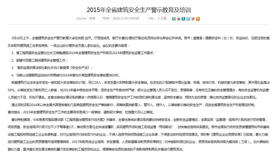 3月18日上午,全省建筑安全生產(chǎn)警示教育大會在合肥 召開。廳黨組成員、副廳長曹劍/建設(shè)廳副巡視員陳幼年出席會議并講話。各市(直管縣)建委安全科(處)長、安監(jiān)站長、在肥注冊的省及合肥市建筑施工總承包...