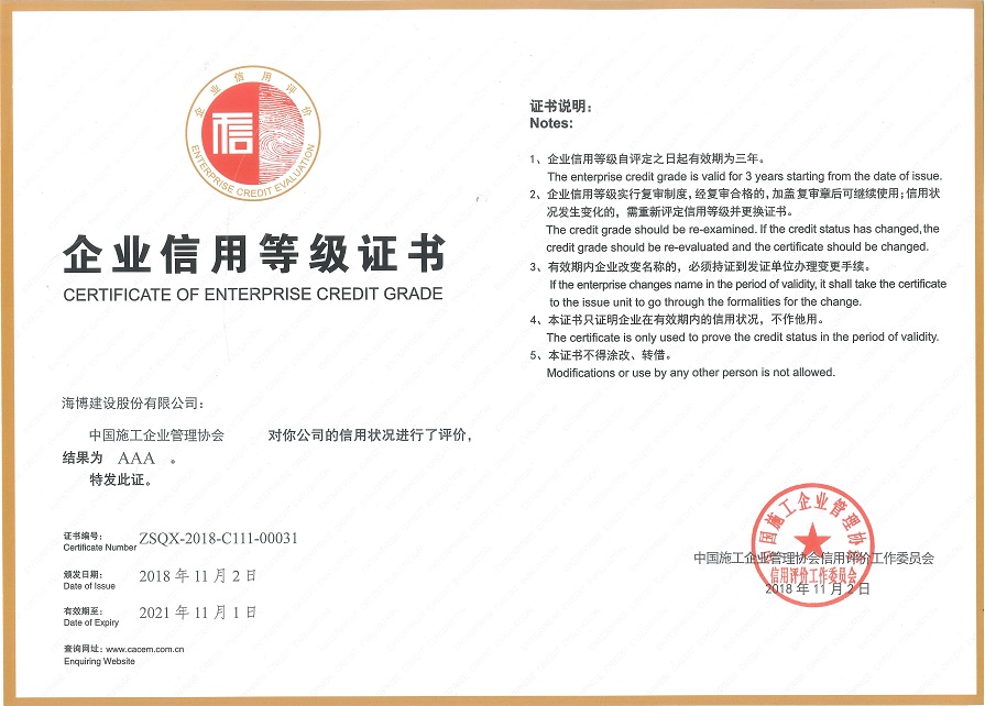 12月4日,從中國施工企業(yè)管理協(xié)會在北京召開的“2018年工程建設(shè)誠信企業(yè)推介大會”上傳來喜訊,在2018年度工程建設(shè)企業(yè)信用評價工作中,我司信用等級被評定“AAA”級,這是繼水利部給予評定的“AAA”級之后,榮獲的第二項國家主...