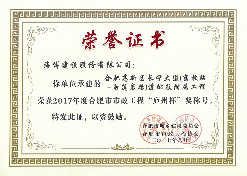 我公司承建的合肥高新區(qū)長寧大道(畜牧站-白蓮巖路)道排及附屬工程,榮獲了2017年度合肥市市政工程“廬州杯”獎。
