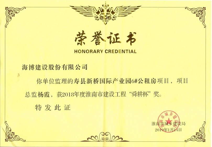 日前,淮南市城鄉(xiāng)建設(shè)局公布了2018年度淮南市建設(shè)工程優(yōu)質(zhì)工程獎(jiǎng)名單,我司承擔(dān)監(jiān)理的壽縣國(guó)際產(chǎn)業(yè)園6#公租房項(xiàng)目喜獲2018年度淮南市建設(shè)工程“舜耕杯”獎(jiǎng)。