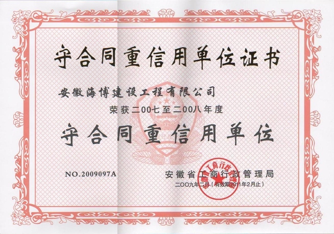 近日,省工商行政管理局正式給我公司頒發(fā)2007—2008年度省級“守合同、重信用”榮譽證書。