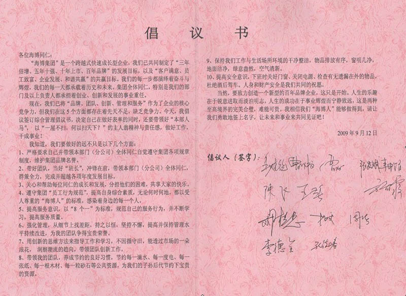 9月12日下午,公司領(lǐng)導(dǎo)及各部門負(fù)責(zé)人集體在公司發(fā)起的“提高綜合管理水平及自身素養(yǎng)”的倡議書上簽字,號(hào)召公司全體員工以更高標(biāo)準(zhǔn)要求自己,以“一屋不掃,何以掃天下?”的主人翁精神和責(zé)任感,做好工作,提高業(yè)務(wù)水平和自身素養(yǎng),做一個(gè)受人尊敬的“海博人”。